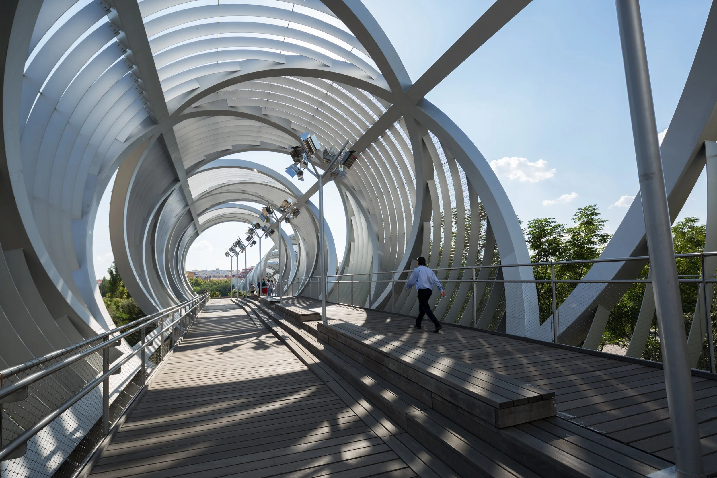 The burying underground of the highway that ran along the edges of the Manzanares river provided the opportunity to open up a new urban territory to the inhabitants of Madrid: the Manzanares Park. A series of bridges over the river allow passage from one side of the park to the other. Designed to link the neighborhoods on the right and left banks of the river, the Arganzuela Footbridge is the longest of all the bridges across the river.